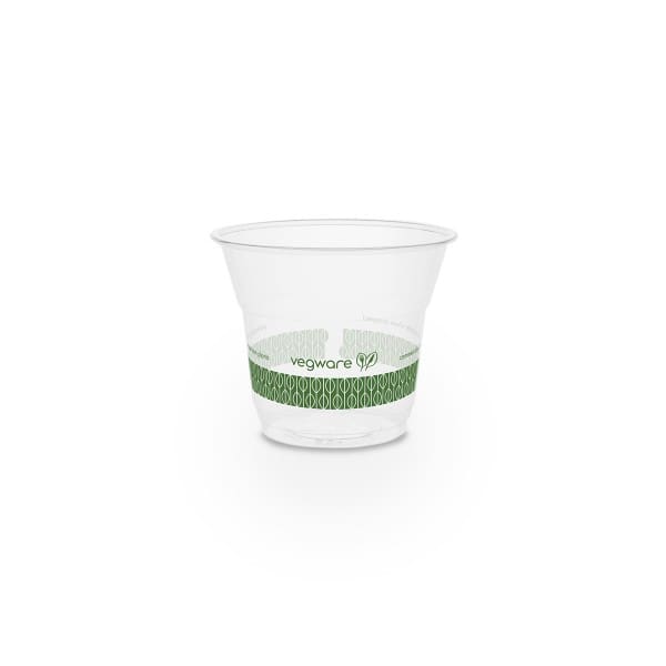 Plant-based clear cup, to fit Vegware's 76-Series lids. For cold drinks, desserts, mini salads, or healthy snacks. Made from PLA, a renewable material made from plants. Clear for visibility. Vegware messaging in green. Award-winning quality by Vegware, made from plants. Commercially compostable where accepted.